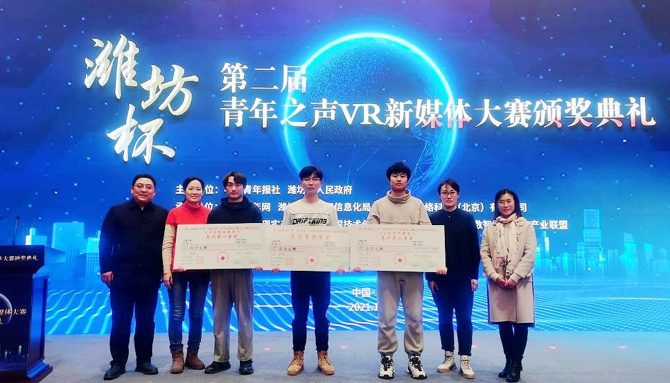 2021年12月30日,第二届青年之声VR新媒体大赛总决赛颁奖典礼在富华国际会议中心举办。公司雷火竞技官方网站参赛的作品《龙宫探宝》获得总决赛唯一的特等奖;《潍坊非遗风筝VR展示》获得总决赛一等奖;《数字校园》获得总决赛三等奖。王世霖、王梦禹、贺春旭三名同学代表团队上台领奖,王世霖同学作为员工代表上台发言。