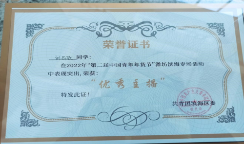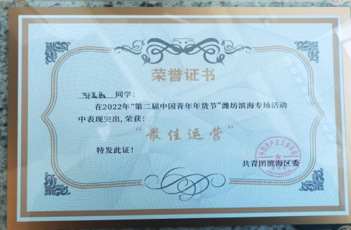 1月12日-13日,第二届“中国青年年货节”潍坊滨海专场活动在潍坊滨海第二创业大厦举办,公司雷火竞技官方网站员工郭嘉鑫和刘佳欣参加了本次活动,经过精心准备,两位同学分获“最佳运营”和“优秀主播”称号。